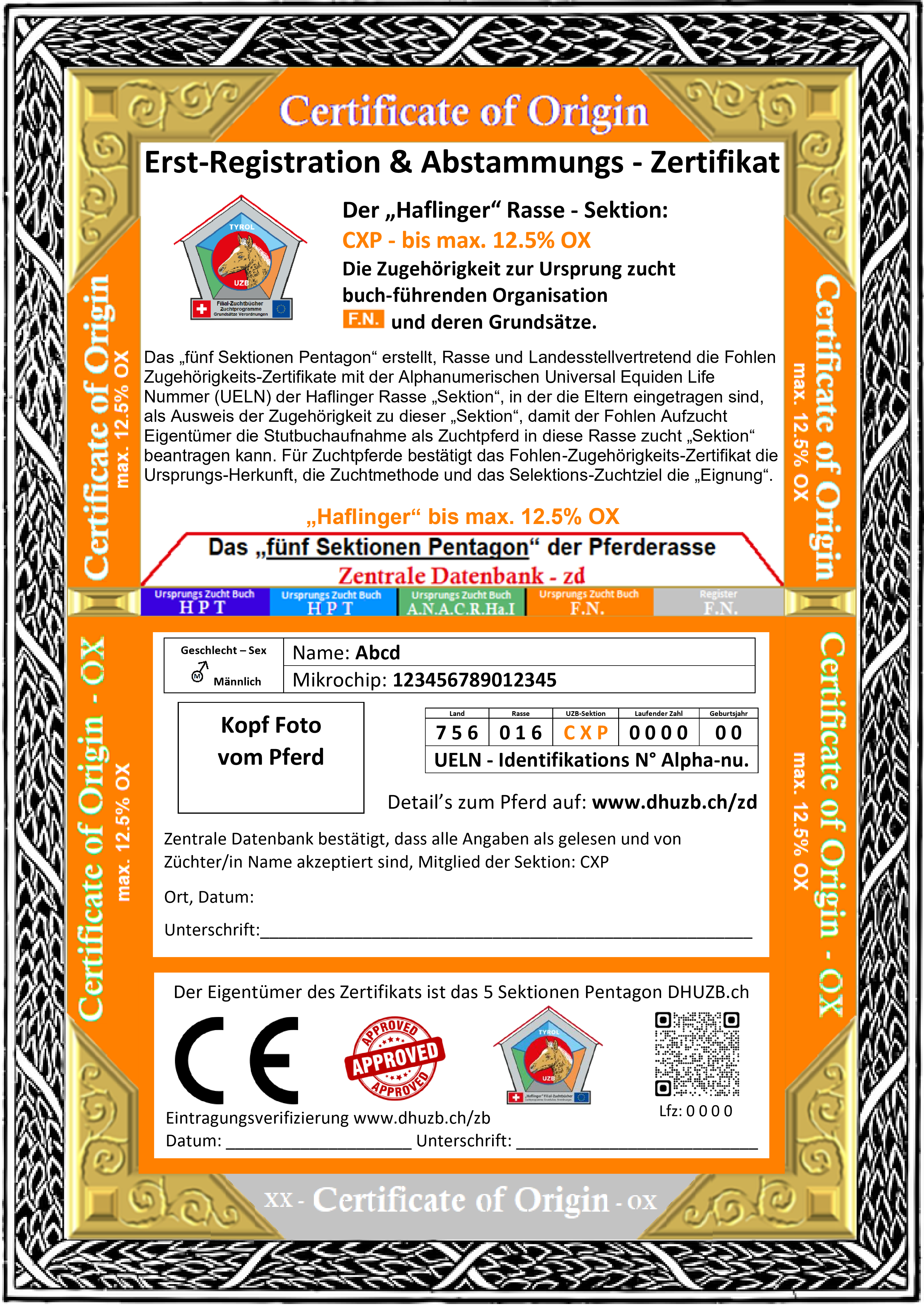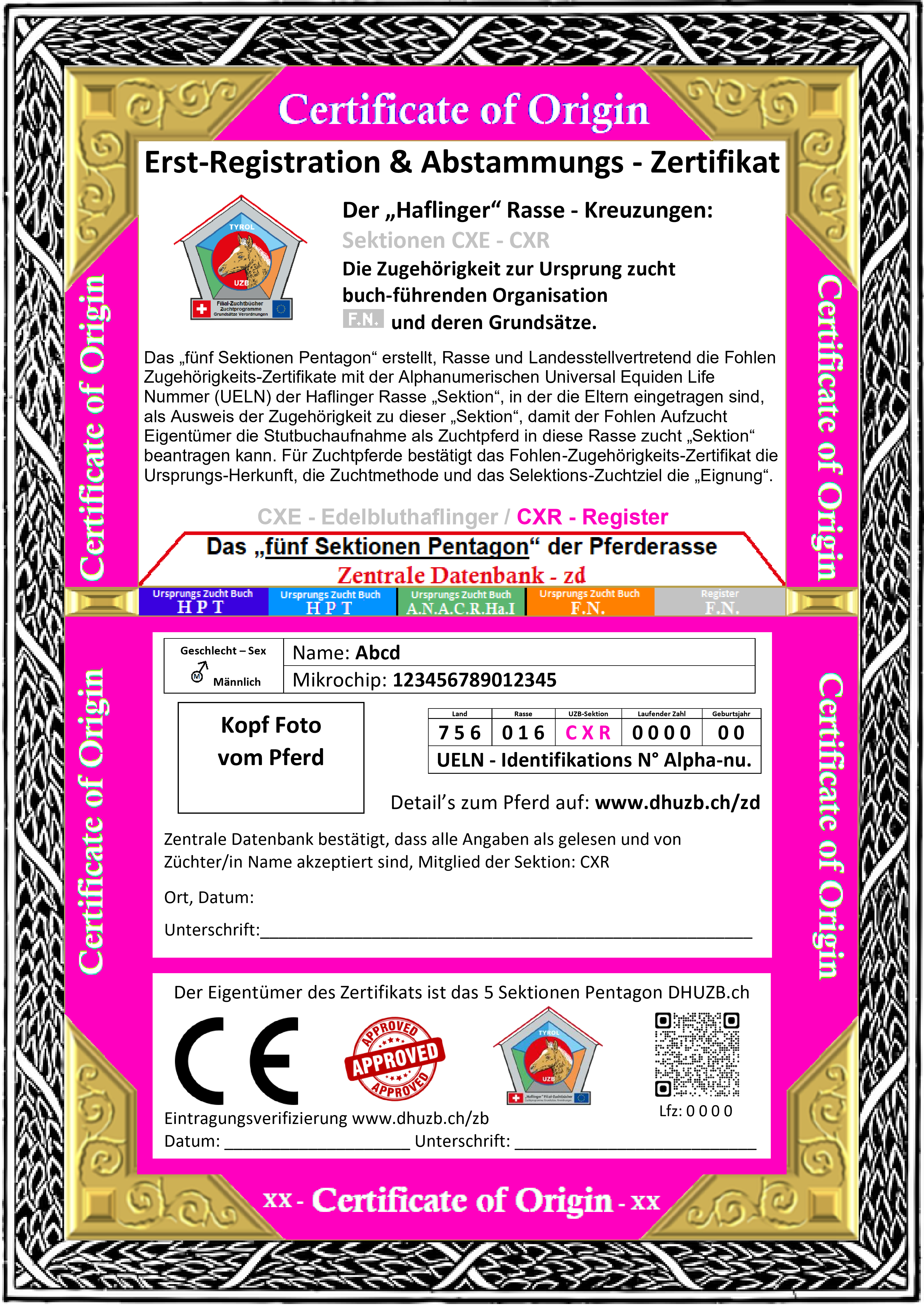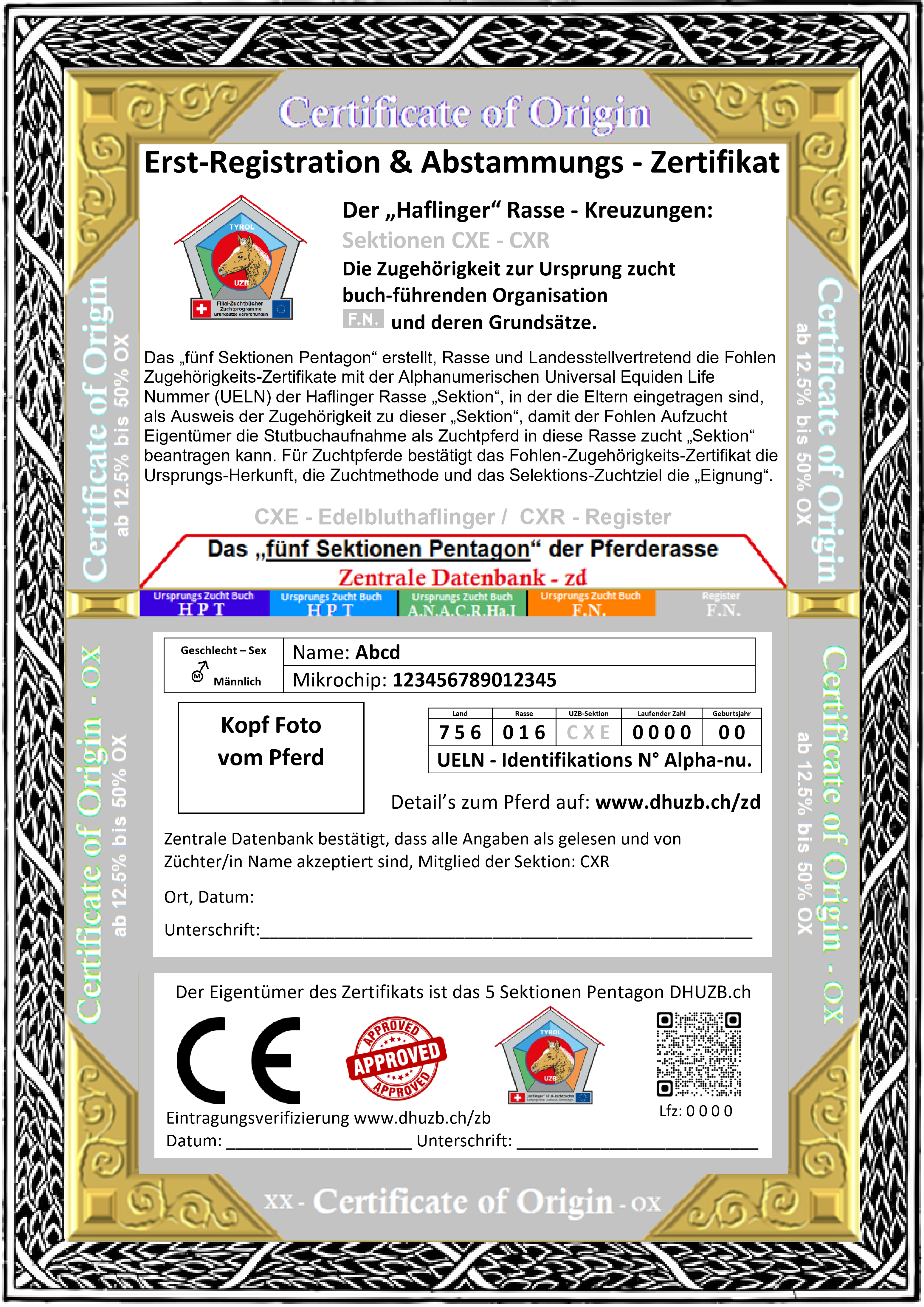 Das Fohlen Erst-Registrations „die Herkunfts- Zugehörigkeits Lebensnummer UELN“ - in der Schweiz geboren! ist gültig bis zur Zuchtbuch Aufnahme ab 2 1/2 Jahren in die entsprechende Sektion als Zuchtpferd. Für Zuchtpferde bestätigt das Zugehörigkeits „Certificate of Origin“ die Ursprungs-Herkunft und zugehörigkeit, die Zuchtmethode, das Selektionsziel und die „Eignung“.